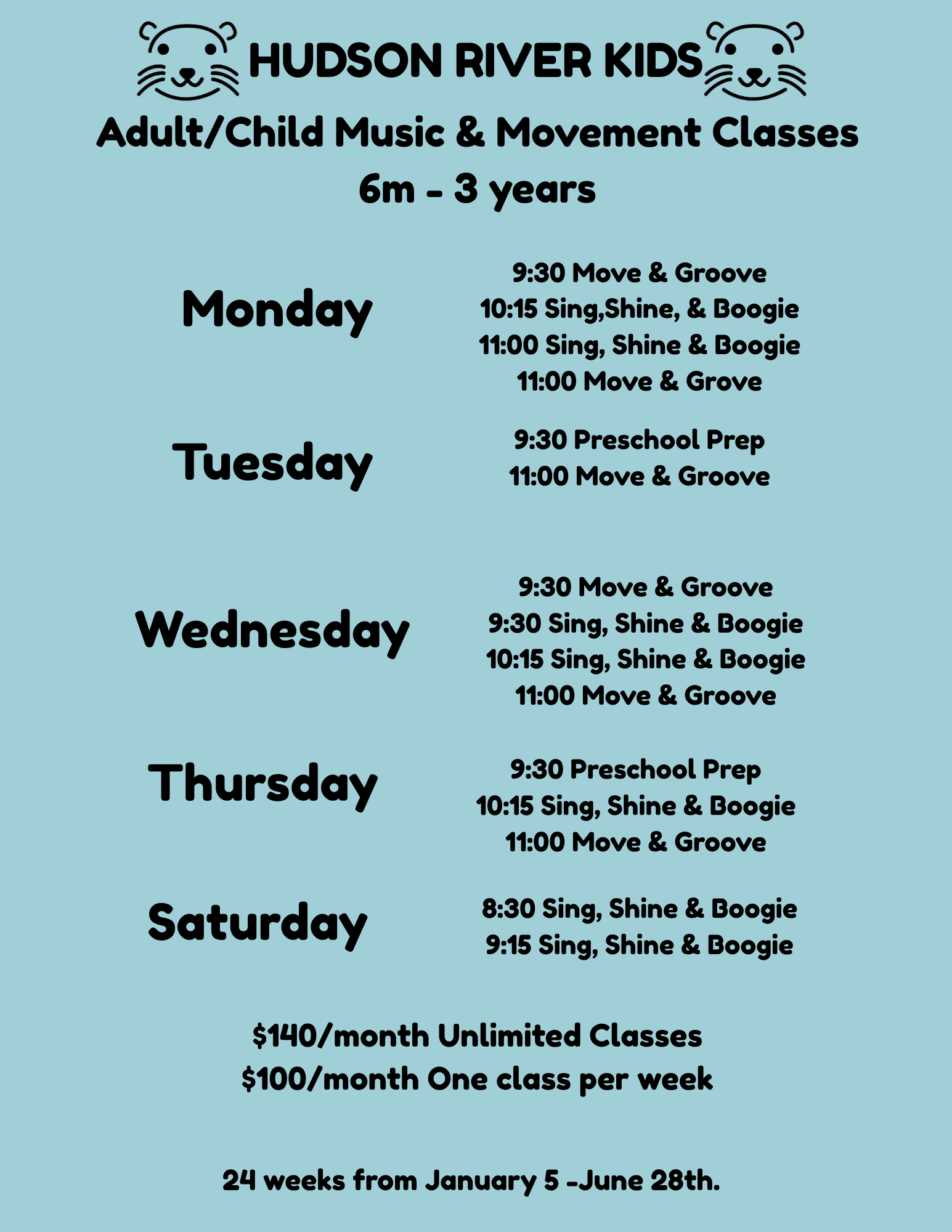 Hudson River Kids is inclusive of children & families of all learning levels. If you’re not sure a class will be a good fit for your child, please come try one. We know that children all learn in unique ways.